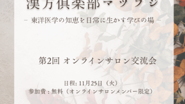 漢方俱楽部マツフジ 第2回 オンラインサロン交流会日程: 11月25日(火)時間 : 21:00~(日本時間)参加費 : 無料(オンラインサロンメンバー限定)毎月1回(+α)のオンライン交流会です。近況や感じていることを気軽にお話できました...