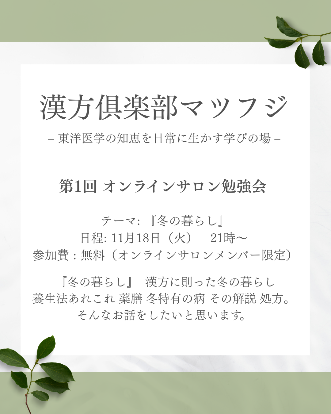 「からだ」と「こころ」を整える東洋医学の知恵を、毎日の暮らしに。漢方倶楽部マツフジは、講義・質疑応答・ブログ発信を通して、漢方の世界をやさしく学べるオンラインサロンです。