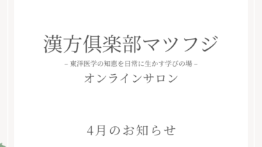 お知らせ 4月のお知らせ こんにちは、漢方倶楽部マツフジです。4月は環境の変化も多く、東洋医学では「肝」の働きが活発になることで、気の巡りが乱れやすい時期とされています。そのため、ストレスや疲れが溜まりやすく、心身のバランスを崩しやすい季節でもあります。このような時... 2026.04.01 お知らせ